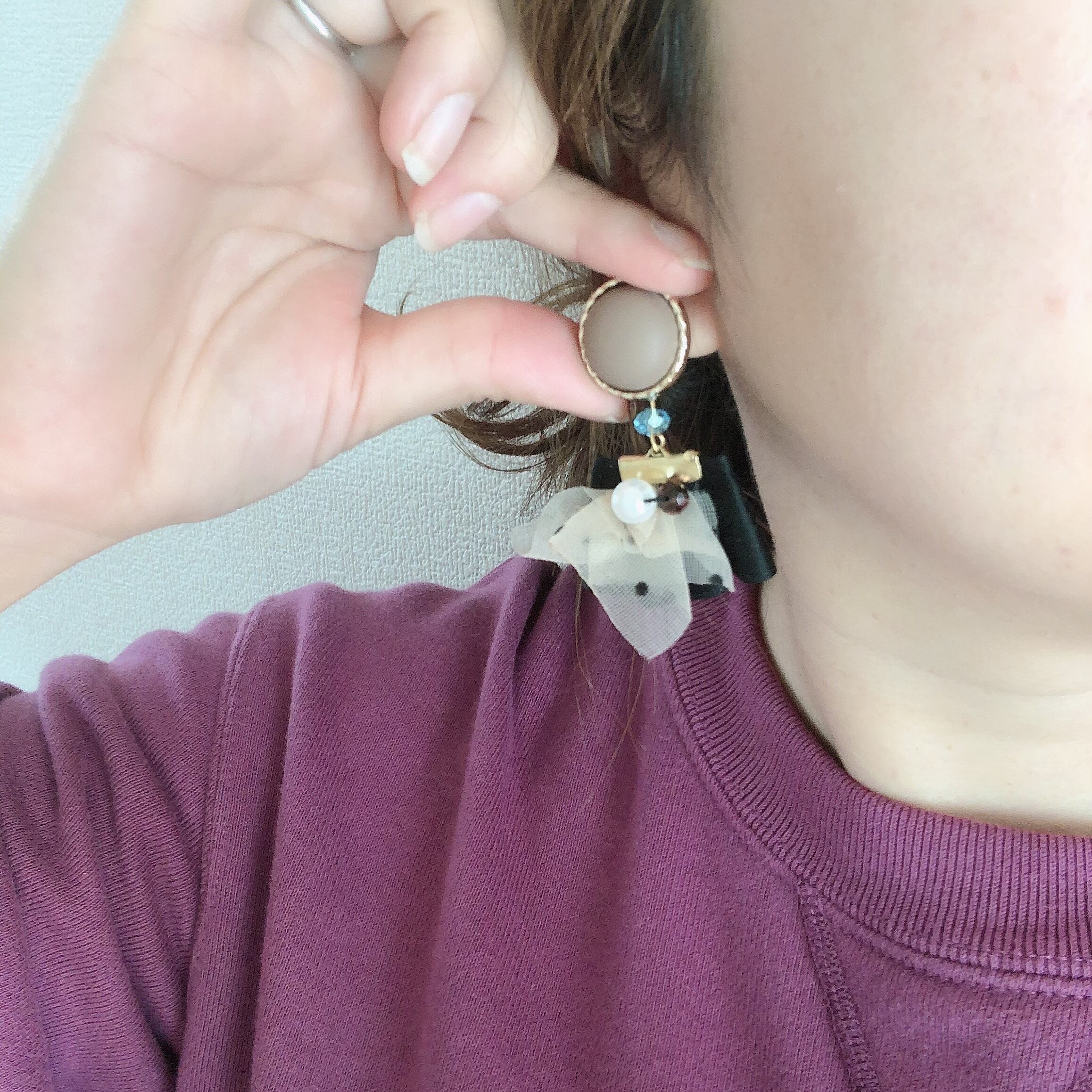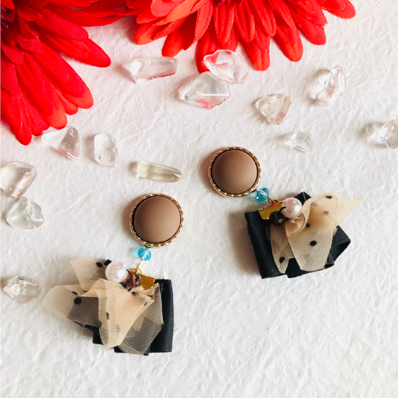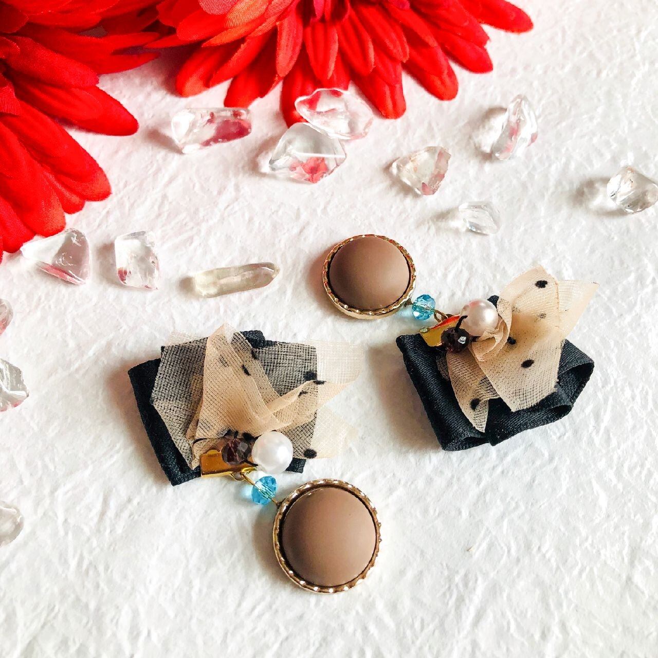 【ハンドメイドピアス】ドット柄フリル×グレージュボタンピアス 金属アレルギー対応
